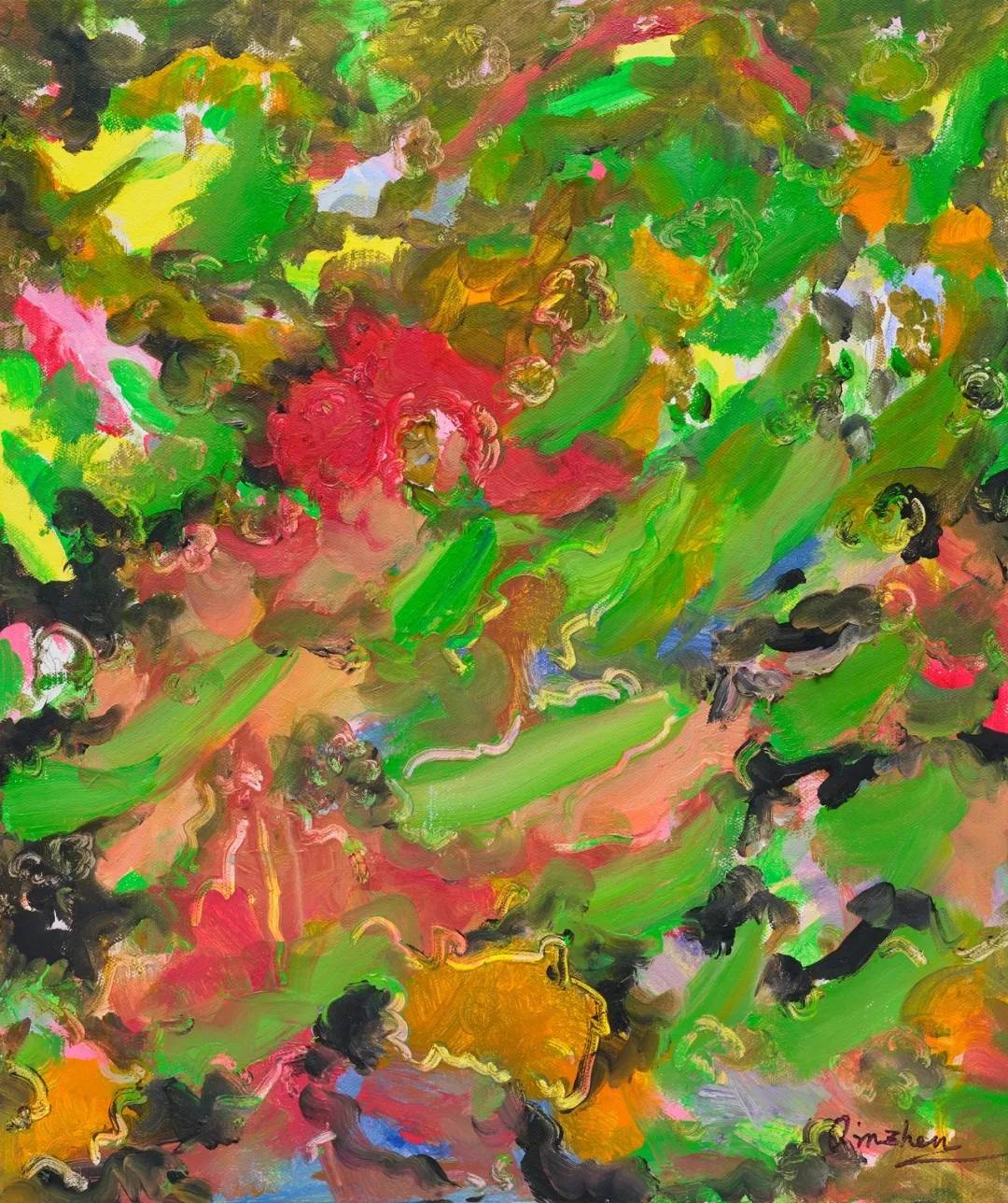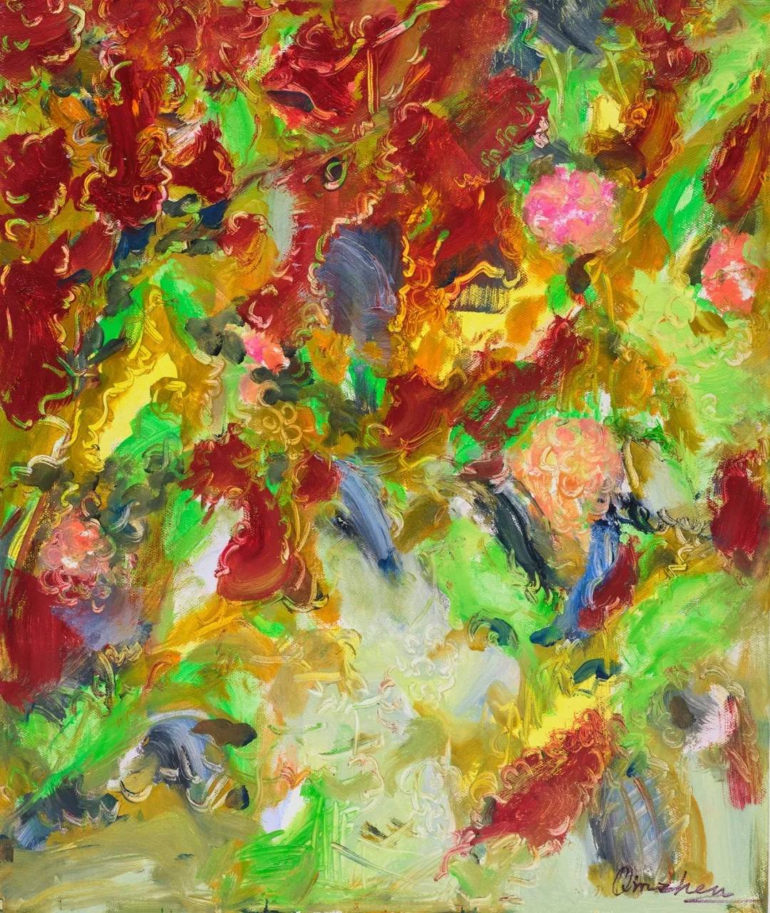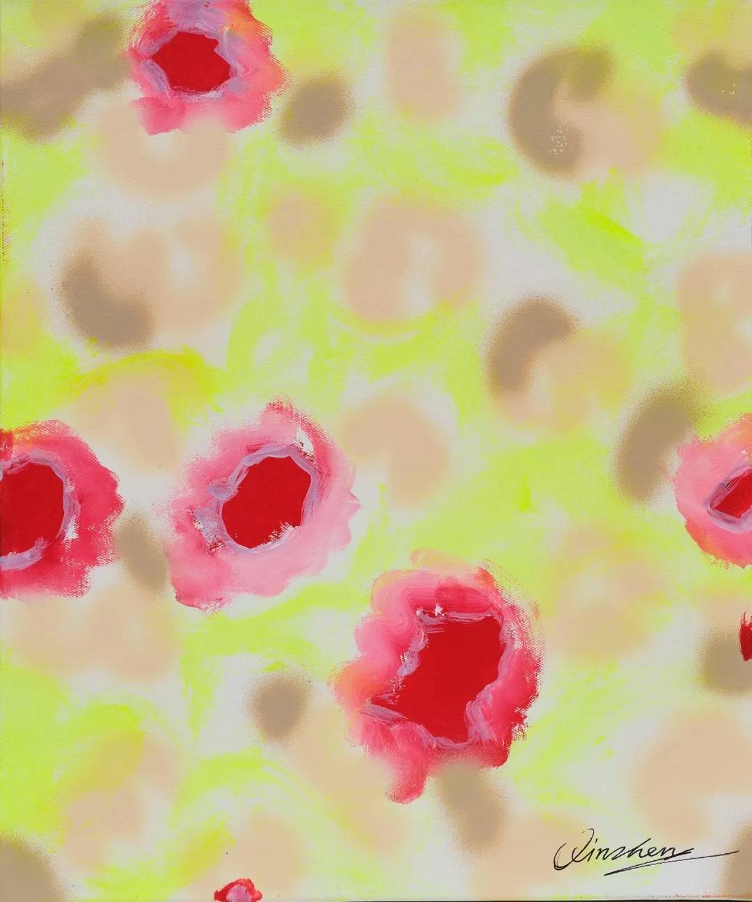 纵观秦蓁作品,她每一阶段的思考往往都是以系列性作品呈现,每个阶段都有她独特的感受和哲思。在那众所周知的三年中,她对之前的思考有了进一步的提炼。如“所有的花”系列是玉兰花系列的升华。此时,秦蓁的着眼点不再是具体的花,而是用一个圈代表一朵花。一个圈可能是玉兰花,也可能是牡丹、康乃馨等,所指向的花朵可能是萌芽,可能是盛开,也可能是已经凋敝。故而,画家在这个系列中捕捉的是创作时流畅地书写意境,以及画面中鲜活对比的色彩和一气呵成的笔触,有时一朵花中的留白,恰恰是画家刻意为之。此时,虽然秦蓁笔下的每一朵花所蕴涵的空间在隐退,时间也在弱化,但却包含着别人不知的意蕴,如果失去,在某种程度上就意味着自我的消隐。