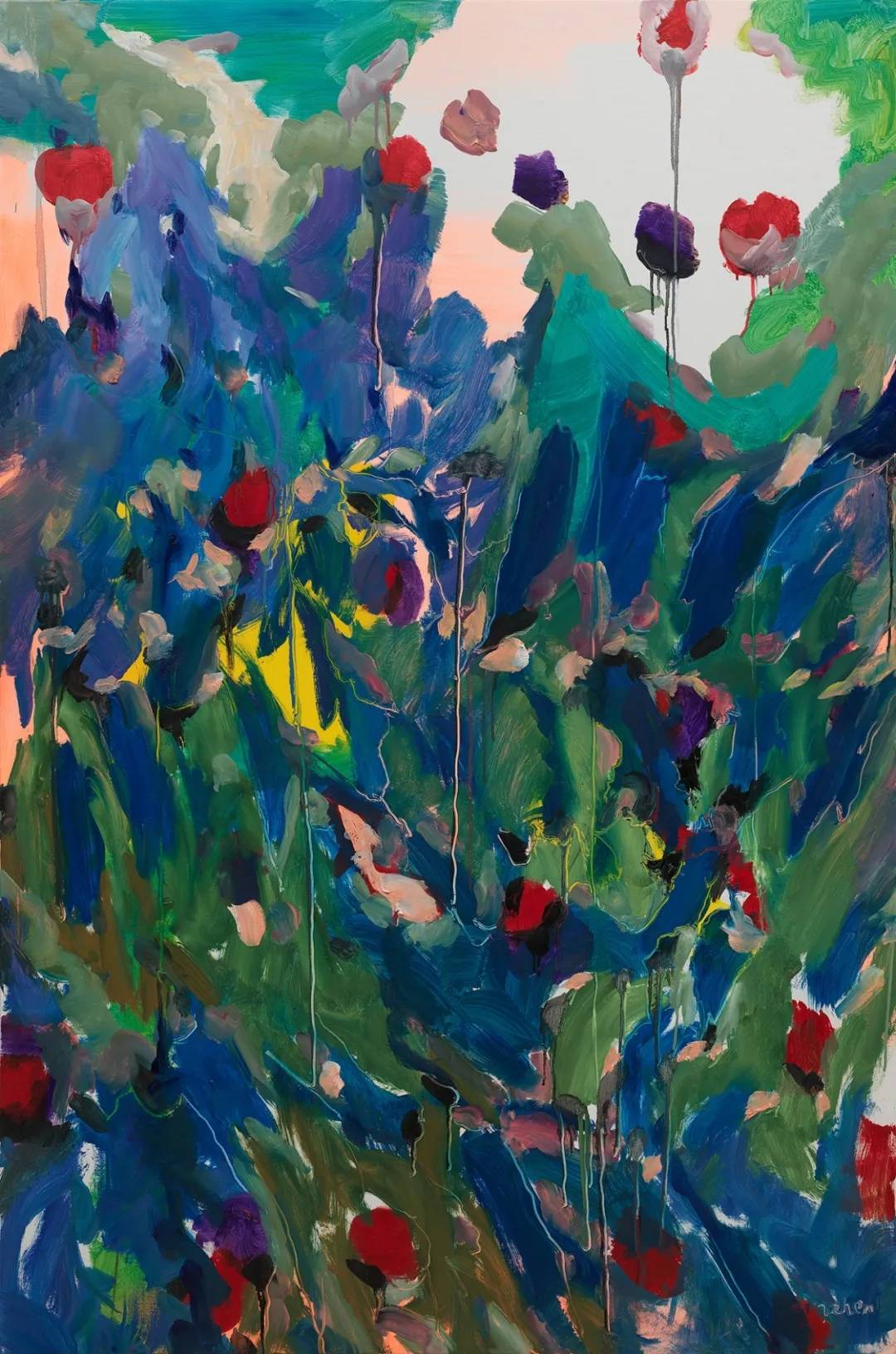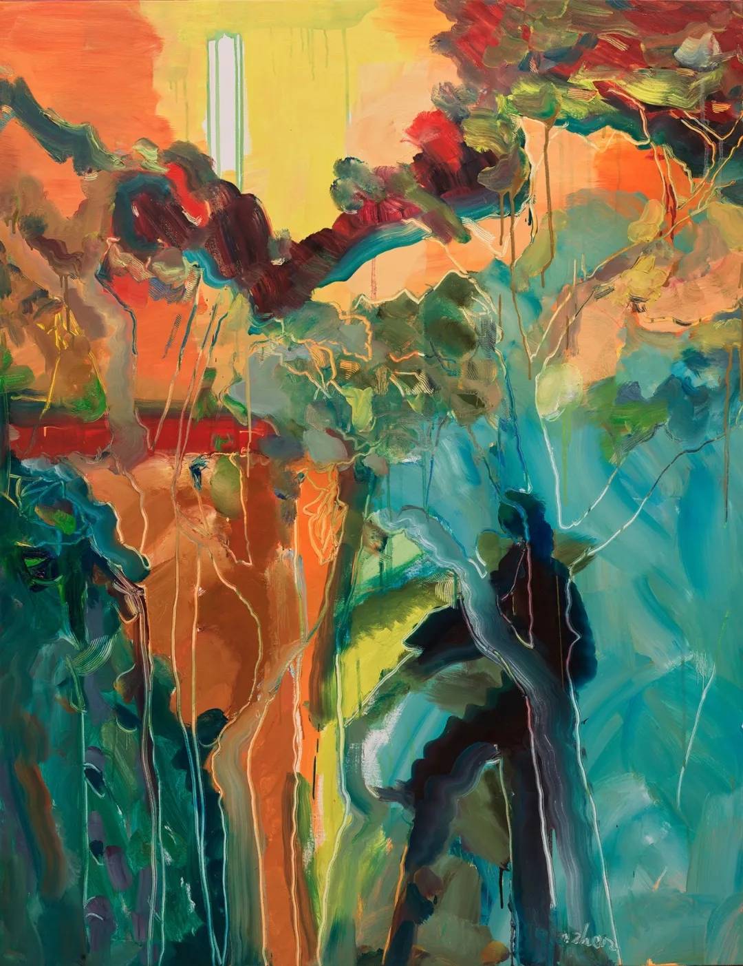 持续创作了五年的“如影如形”系列是秦蓁借助描写景物来梳理内心的方式。在这系列中,她将颜色以极薄的方式在画面上呈现,饱和又鲜艳。众所周知,影常指向人的内心世界、欲望、幻想以及无意识,这之中暗含着一个人的真实面貌。秦蓁的“如影如形”系列传达了一种密切性与亲近感,强调了人与人之间或事物之间的紧密联系,这种联系超越了时间与空间的限制,如同影子与形体一般,无论外界环境如何变化,成为彼此生命中不可或缺的一部分,但需要摆脱束缚和限制才能达到自由的自我彼岸。故而,观者能在她的作品看到稳定、平静、时空、鸿蒙……