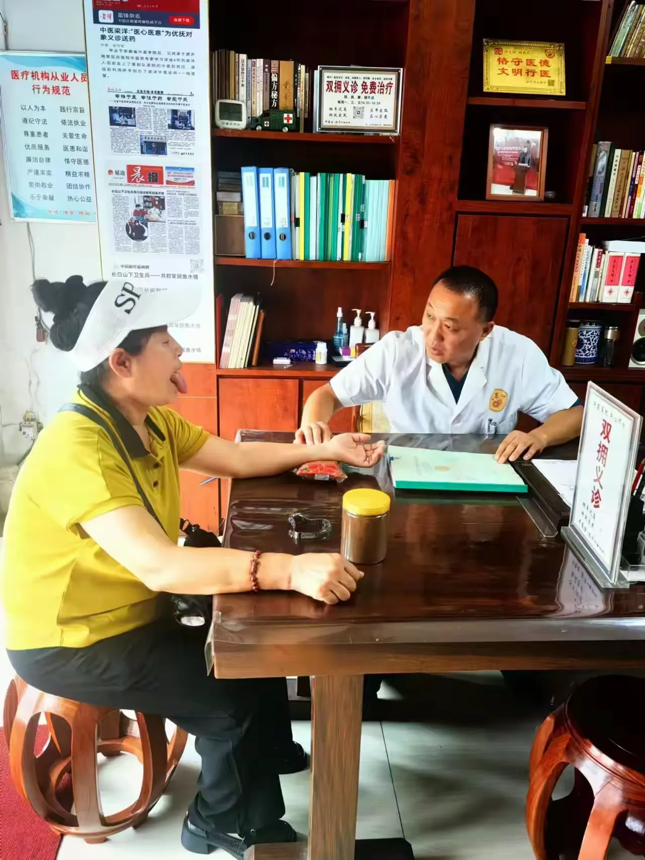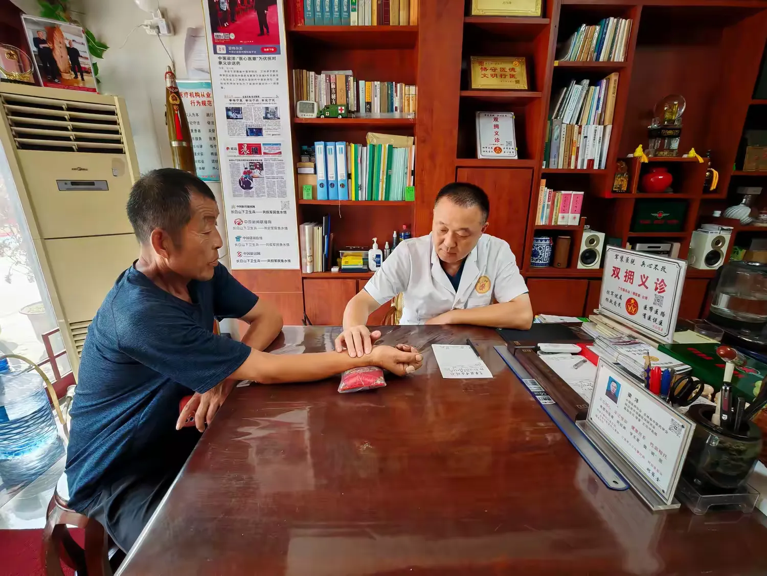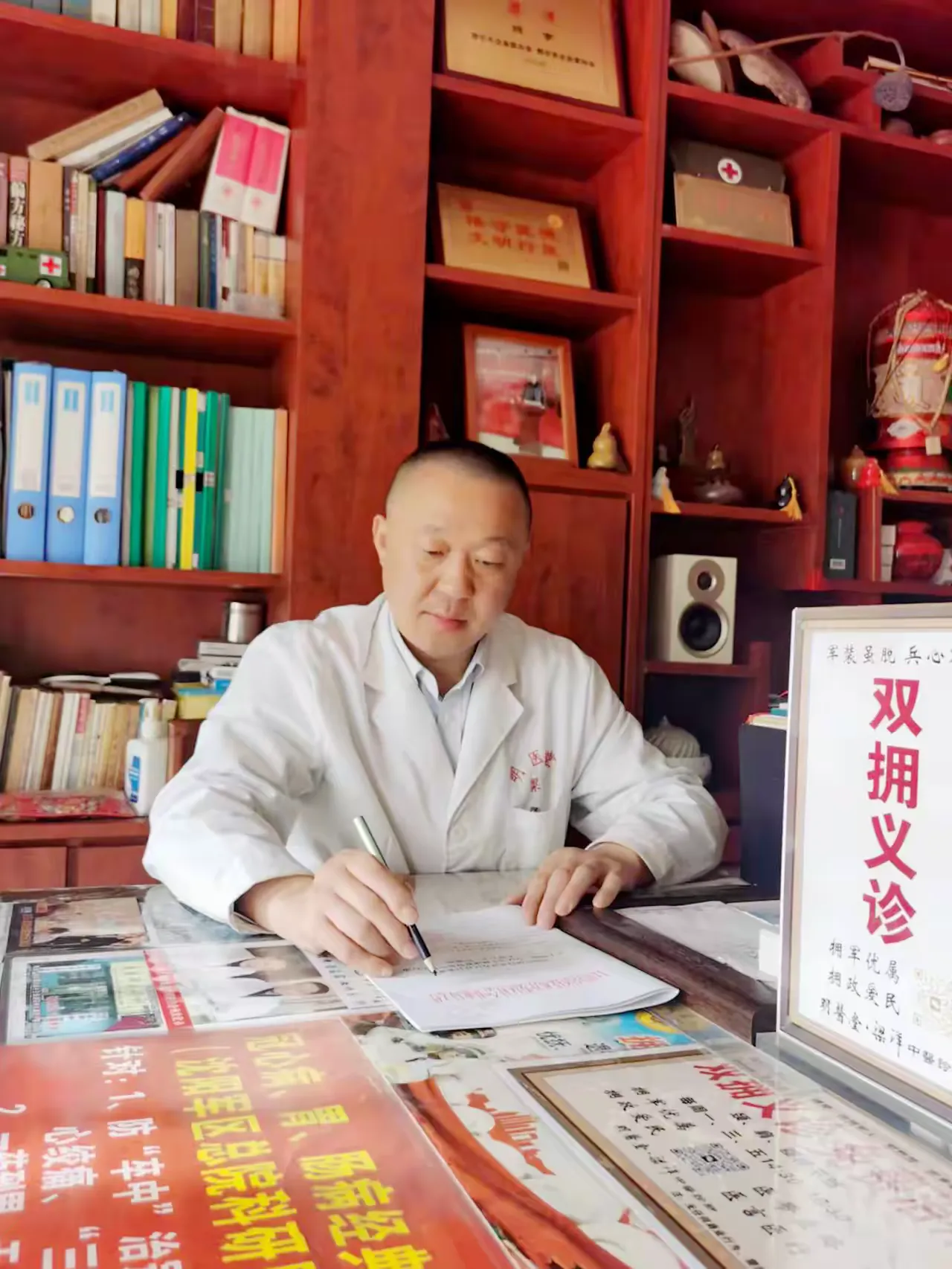 “身为退役军人,又是中医师,我深知战友们训练辛苦,最牵挂家中亲人健康。我要替战友们守好家人健康这道关。”这句承诺,梁洋一守就是二十八年。退役后,他脱下军装,却未脱下责任,将“双拥义诊”的初心延续至今。从敦化到日照,从街头巷尾到乡镇村落,他的足迹遍布齐鲁大地的烟台、潍坊、东营等地,每逢重要节日,便穿梭在乡镇医疗机构,为军属、退役军人、老年患者及优抚对象义务诊疗,风雨无阻。他的诊所开到哪里,“双拥义诊服务站”的标牌就设到哪里,二十八年间,义诊送药惠及数万人次,用实际行动诠释着“退役不褪色、退伍不褪志”的军人担当,被《中国军转民》杂志赞誉为“双拥义诊路上的白衣老兵”。