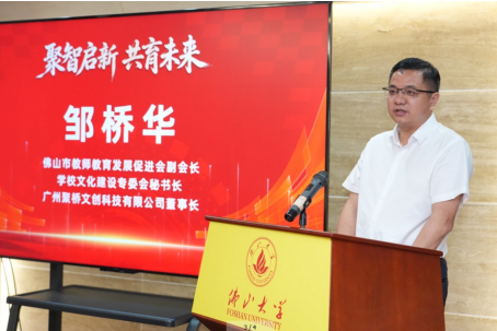 为汇聚教育工作者智慧力量,系统推进学校文化建设专业化、体系化、品牌化,2026年4月16日上午,佛山市教师教育发展促进会学校文化建设专委会成立大会暨揭牌仪式在佛山大学江湾校区隆重举行。会上,广州聚桥文创科技有限公司创始人、董事长邹桥华当选首届秘书长。